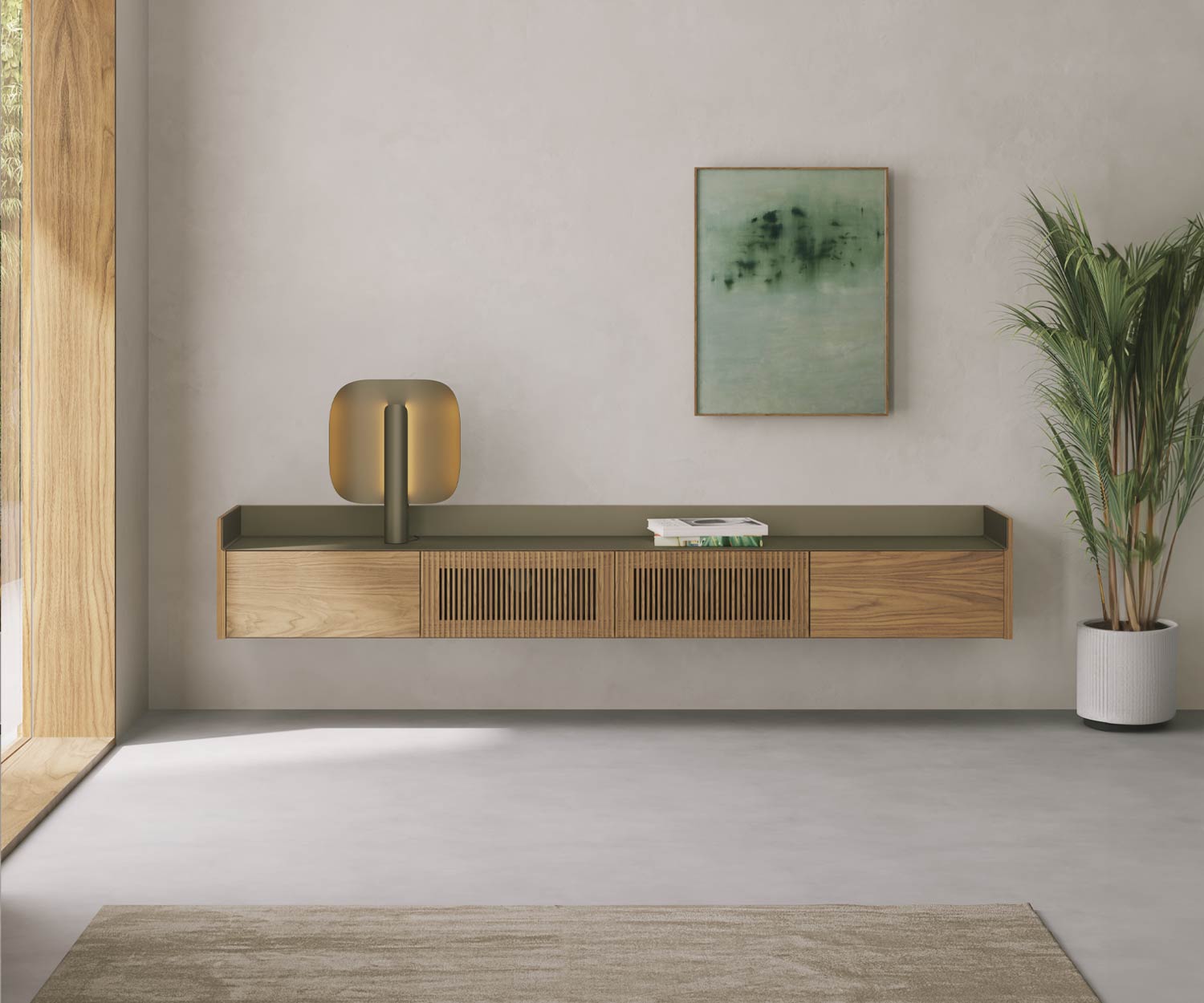 Het TV lowboard Stockholm heeft infrarood doorlatende lamellen waarachter elektronische apparaten eenvoudig kunnen worden bediend. De lamellen helpen ook om de warmteuitwisseling te optimaliseren. De deuren van het dressoir scharnieren bij het openen zonder handgrepen naar beneden (hoek van 105°).