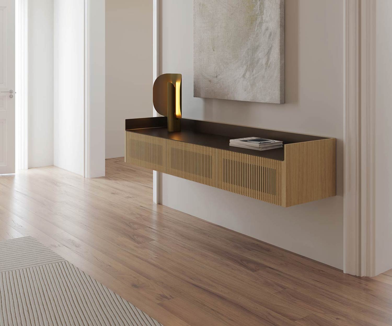 De wanduitvoering heeft hoogwaardig beslag met een hoog draagvermogen. Per deurelementworden twee wandbeslagen geïnstalleerd, wat resulteert in een draagvermogen tot 40 kg per strekkende meter. Let op: vanwege het zware gewicht van het meubelstuk is een stevige muur vereist voor wandmontage.