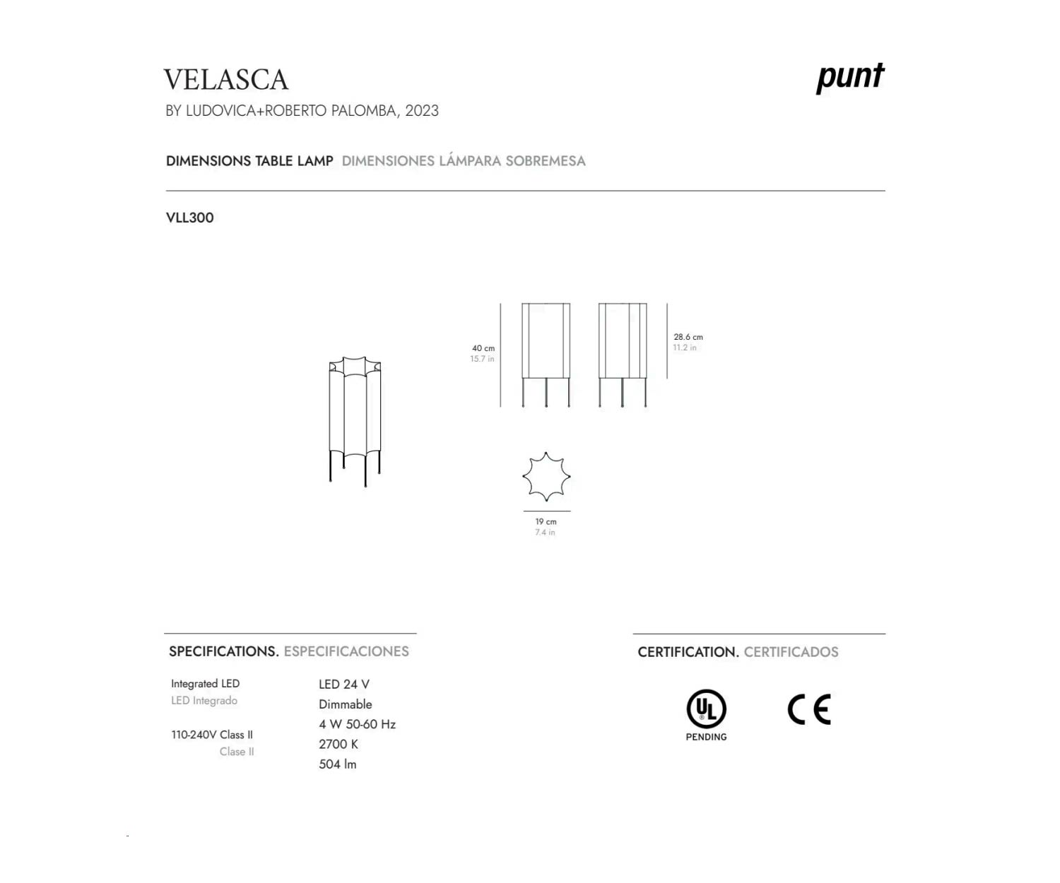 Punt Het Velasca armatuur is verkrijgbaar met geïntegreerde LED 24 V en is dimbaar. De schakelaar wordt rechtstreeks op de kabel aangesloten en kan ook als voetdimmer worden gebruikt.