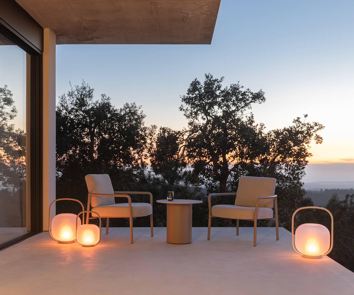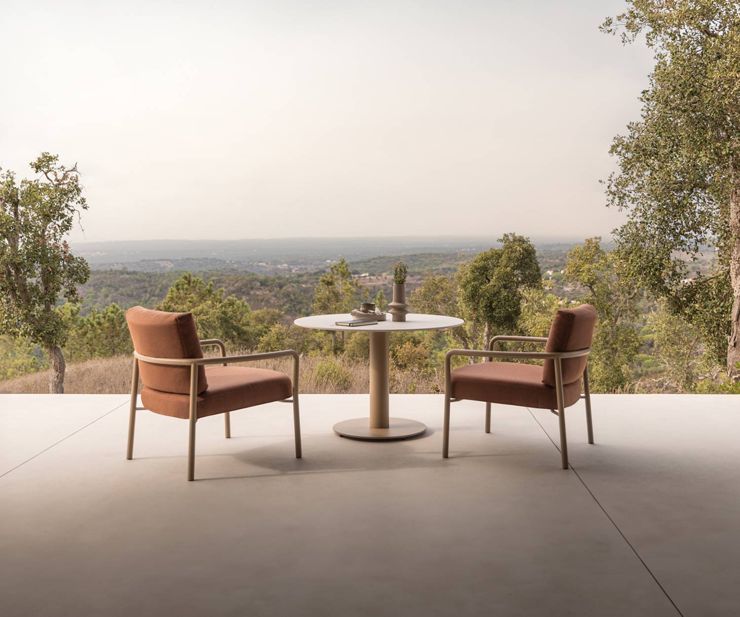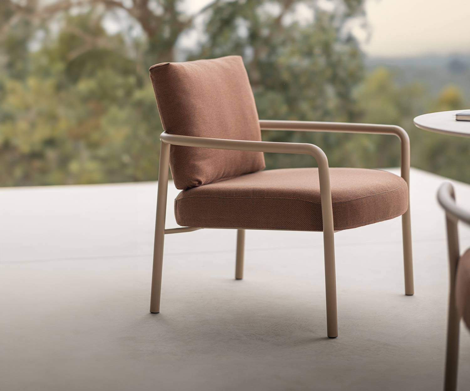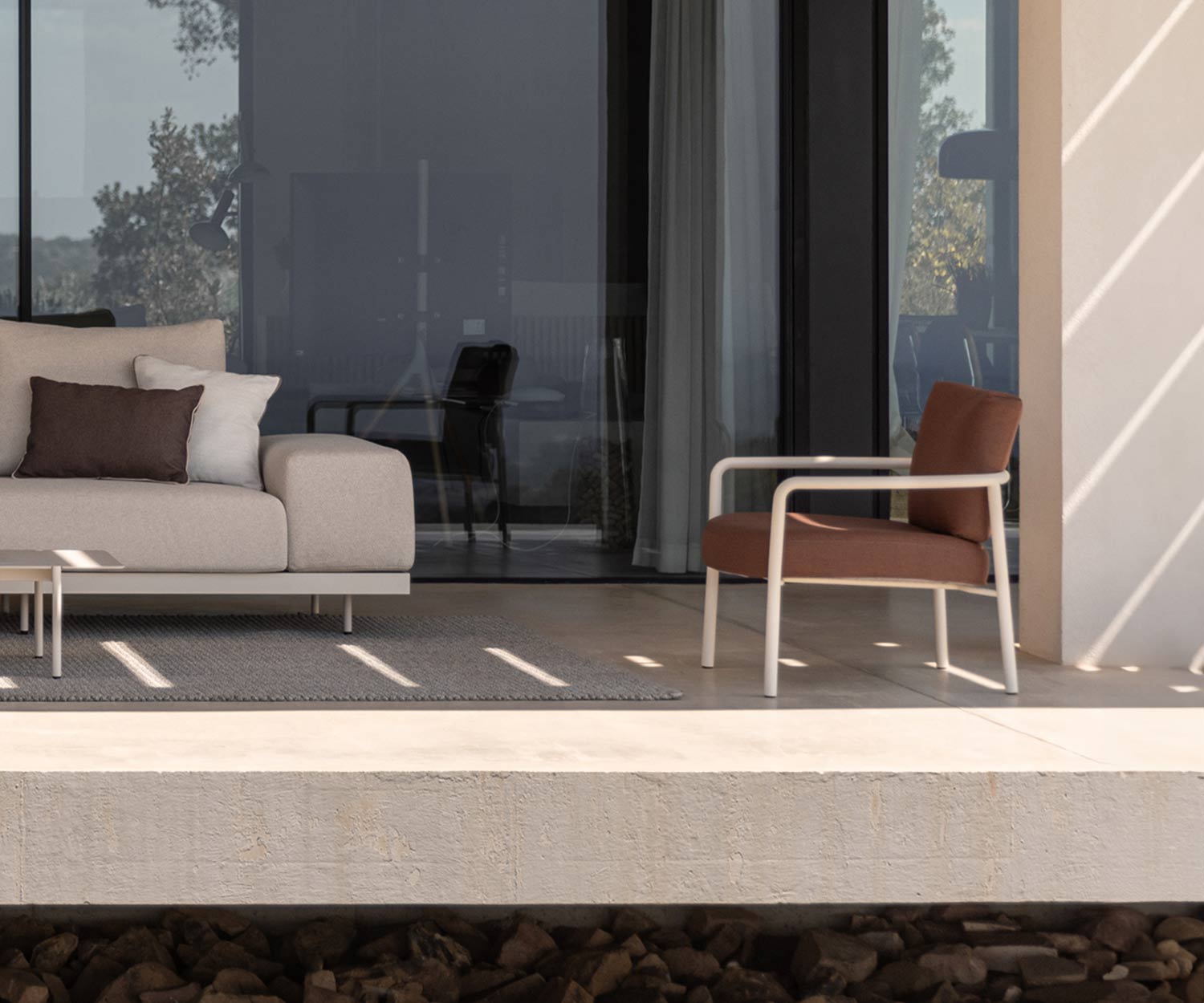 Het frame van de Kori outdoor fauteuil van Todus is verkrijgbaar in de kleuren wit, latte beige of antraciet, waardoor hij moeiteloos past in de meest uiteenlopende buitenconcepten. De stoffen bekleding is verkrijgbaar in elegante kleuren zoals zandbeige, donkeroranje, donkergroen, grijs of antraciet - een divers palet dat kan worden gebruikt om individuele accenten te leggen.